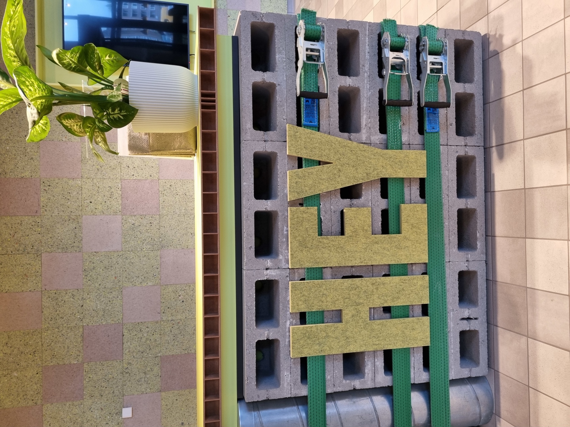 - De lampen boven de ontvangstbalie zijn gemaakt van karton.